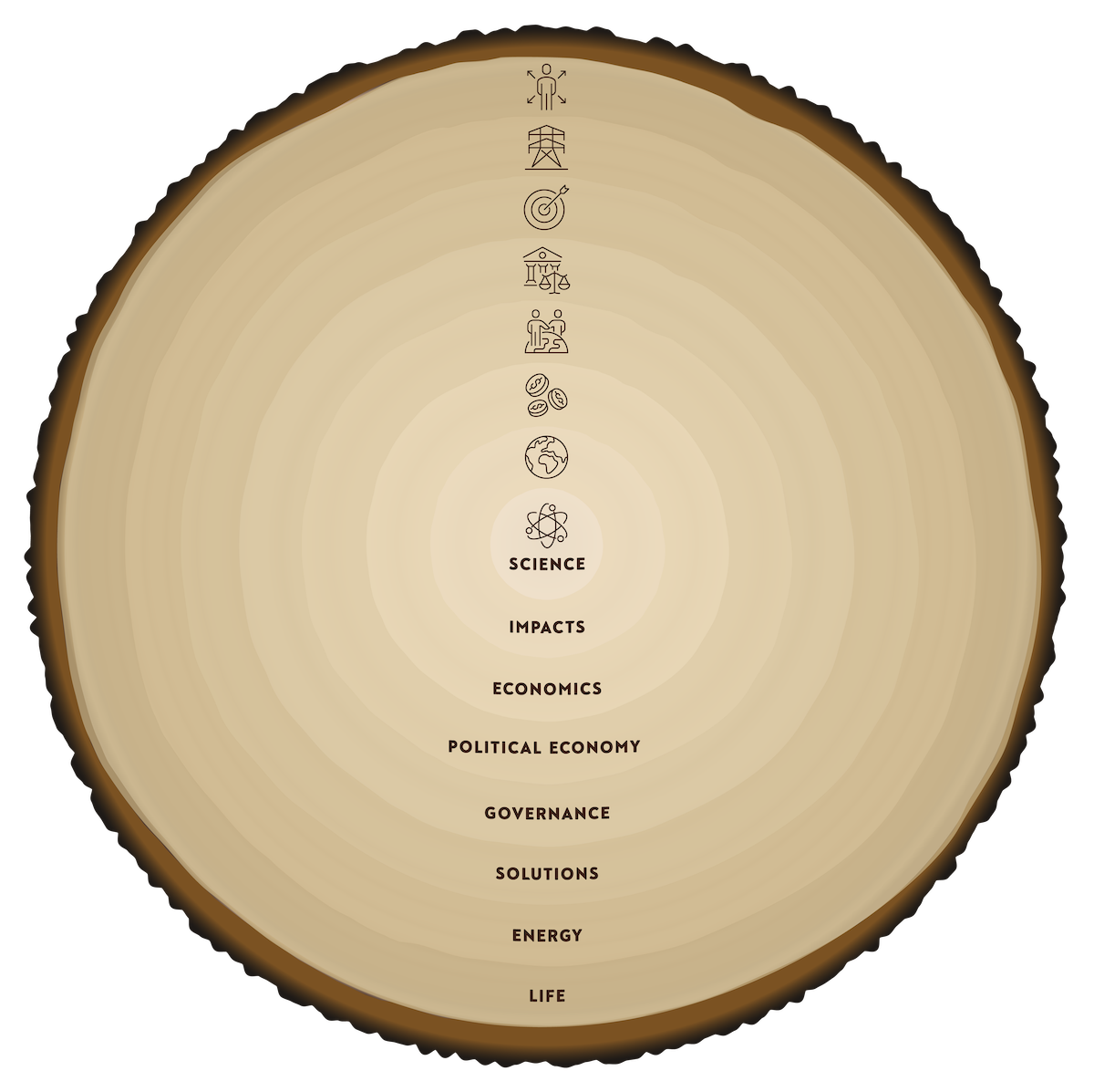 It’s a visual guide to understanding climate and energy – designed to hold the big picture together, from science and history to impacts and justice, from solutions and false solutions to net zero and individuals. Each ring of the Trunk adds coherence, helping you build a clearer picture.